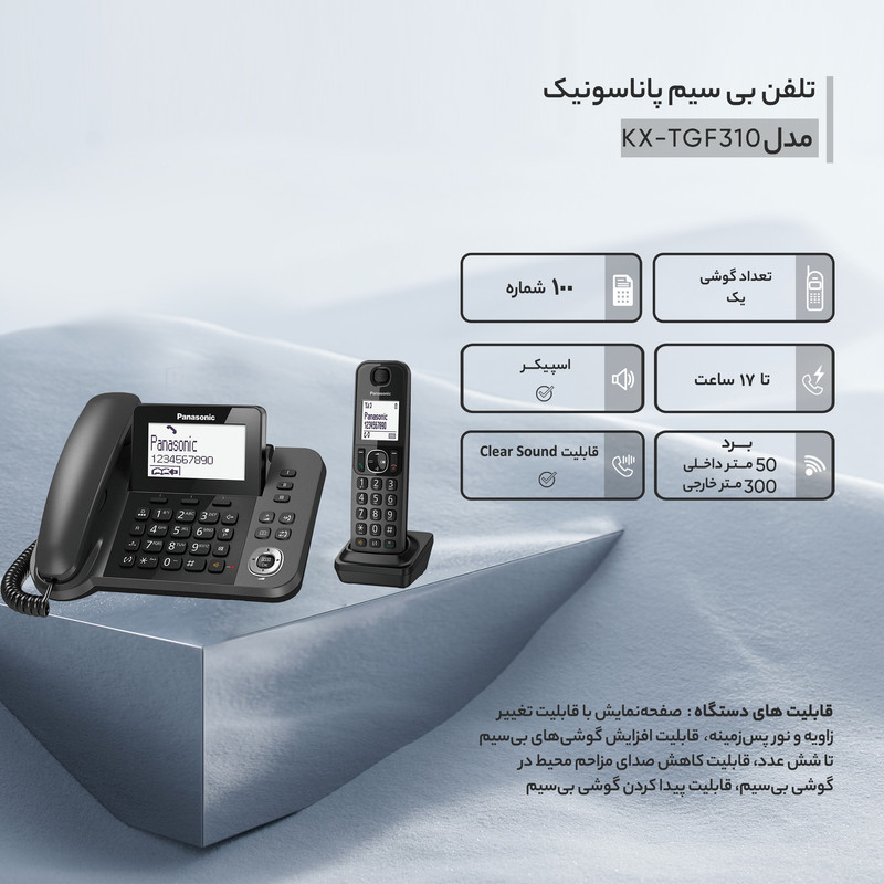 دستگاه «KX-TGF310» ساخت شرکت «پاناسونیک» تلفنی رومیزی و بیسیم است و کاربری دوگانه دارد. با نگاهی به این تلفن دوستداشتنی، اولازهمه مجذوب ظاهر زیبای آن خواهید شد که رنگهای مشکی و انحناهای موجود در بدنه و صفحهنمایش بزرگ آن هماهنگی خوبی با یکدیگر دارند. شاید بزرگترین مولفهی طراحی ظاهری این دستگاه، صفحهنمایش موجود روی بدنهی آن باشد که از فاصلهی 2 متری هم بهسادگی قابلرویت است. این صفحهنمایش بزرگ با حروف درشت، در 3 خط اطلاعات تماس و تلفن را به اطلاع کاربر میرساند و میتوان آن را بنا به ترجیح خود زاویهاش را تغییر داد تا محتویات آن به بهترین شکل قابلرویت باشند. همانگونه که گفتیم این دستگاه دارای گوشی باسیم بوده و برای کاربرانی مناسب است که قصد دارند در پشت میز خود از این تلفن استفاده کنند. قابلیت گوشی باسیم تماسهای تلفنی بدون نگرانی از اتمام باتری یا قطعی ارتباط بیسیم را به همراه دارد. از سوی دیگر گوشی بیسیمی هم همراه این دستگاه عرضه میشود تا کاربرانی که حین مکالمات تلفنی ترجیح میدهند حرکت کنند، بهراحتی از این تلفن بهرهمند شوند. دکمهی اختصاصی برای Call Block روی بیس اصلی تلفن تعبیه شده است که با فشار آن حین مکالمه میتوان مخاطب آنسوی خط را به لیست سیاه منتقل کرد تا در تماسهای بعدی بهصورت اتوماتیک رد تماس شود. ویژگی دیگر این دستگاه قابلیت استفاده طی قطعی برق است. هنگام قطعی برق تا مدت محدودی میتوانید از تلفن استفاده کنید. حالت دیگر DND یا همان Do Not Disturb نام دارد که در آن کاربر میتواند مطابق میل خود در زمانهایی مانند شب و هنگام استراحت، تلفن را در حالت DND قرار دهد تا زنگ تلفن به صدا درنیاید. بااینحال میتوان شمارههای خاصی را بهعنوان استثنا در این لیست قرار داد تا حتی در این حالت هم تلفن در هنگام تماس آنها زنگ بخورد. همچنین میتوانید با فشار یک دکمه، حالت Eco را فعال سازید تا تلفن با کاهش قدرت ارتباط رادیویی در مصرف برق صرفهجویی کند. روی گوشی بیسیم قابلیت کاهش صدای مزاحم محیط تعبیه شده است که اگر کاربر در محیط پرسروصدایی باشد، دستگاه بهصورت اتوماتیک صدای مزاحم اطراف را حذف میکند تا مخاطب تماس در شنیدن صدای کاربر به مشکل برنخورد.
